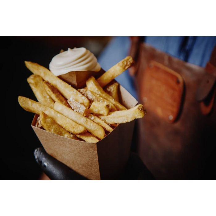 Presenteer een middelgrote friet of snacks in onze duurzame kartonnen frietzak en geef zo een ambachtelijke look aan uw producten. De FSC® kartonnen frietzak is gemaakt van kraft karton en is voorzien van een biologisch afbreekbare PLA (maiszetmeel) coating wat zorgt voor vocht en vetbestendigheid. Het sausvakje boven de friet voorkomt dat men zonder saus komt te zitten en voorkomt bovendien knoeien. Combineer onze duurzame FSC® frietzakken met frietvorkjes en eco servetten.
