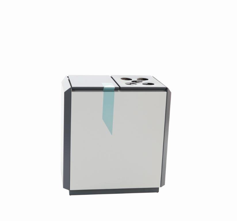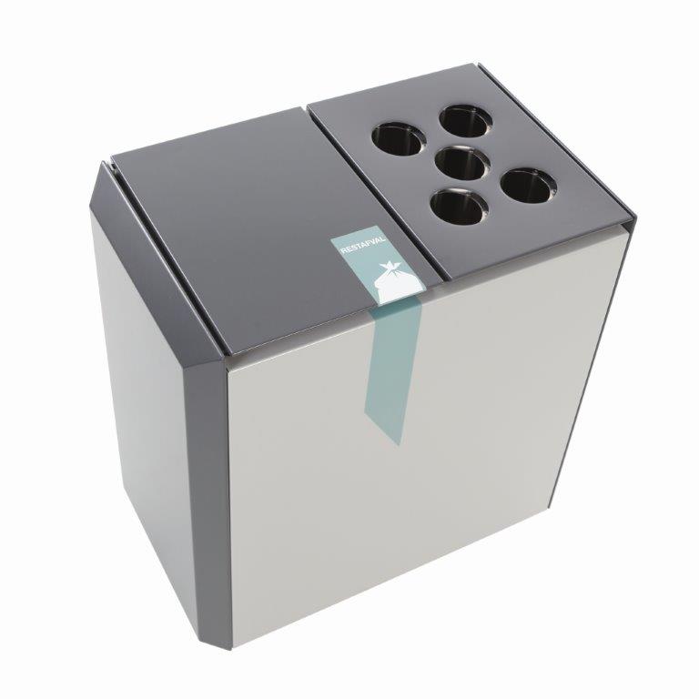 Brandveilige afvalscheidingsunit van hoogwaardig aluminium met 2 binnenemmers waarvan één met bekerinzet. Als het deksel geopend wordt kan de lichtgewicht aluminium binnenemmer gemakkelijk geleegd worden. De binnenemmers hebben handige zakklembeugels die tevens dienst doen als hygiënische handvatten. Compleet met gekleurde stickers voorzien van tekst om de afvalstromen aan te duiden. (In overleg is de tekst en kleur aan te passen). Optioneel is een wielen set leverbaar om de RecycloStar eenvoudig te kunnen verplaatsen. , VB 708413, L 453 b 694 h 745, mm