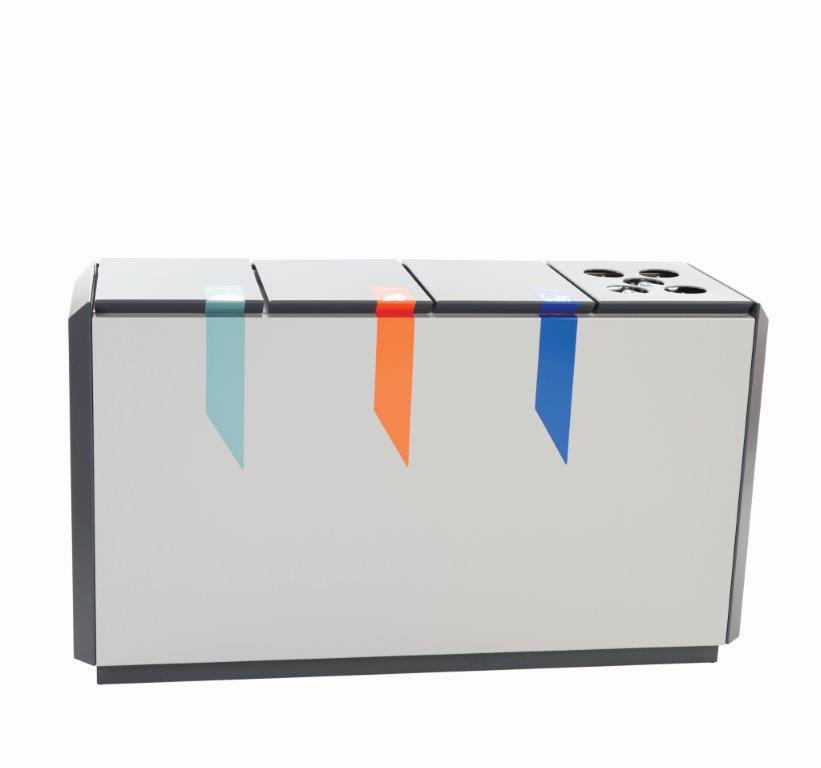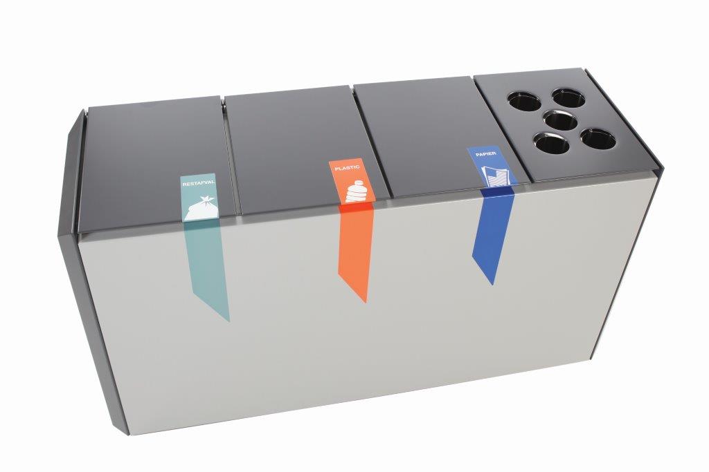 Brandveilige afvalscheidingsunit van hoogwaardig aluminium met 4 binnenemmers waarvan één met bekerinzet. Als het deksel geopend wordt kan de lichtgewicht aluminium binnenemmer gemakkelijk geleegd worden. De binnenemmers hebben handige zakklembeugels die tevens dienst doen als hygiënische handvatten. Compleet met gekleurde stickers voorzien van tekst om de afvalstromen aan te duiden. (In overleg is de tekst en kleur aan te passen). Optioneel is een wielen set leverbaar om de RecycloStar eenvoudig te kunnen verplaatsen. , VB 708376, L 453 b 1300 h 745, mm