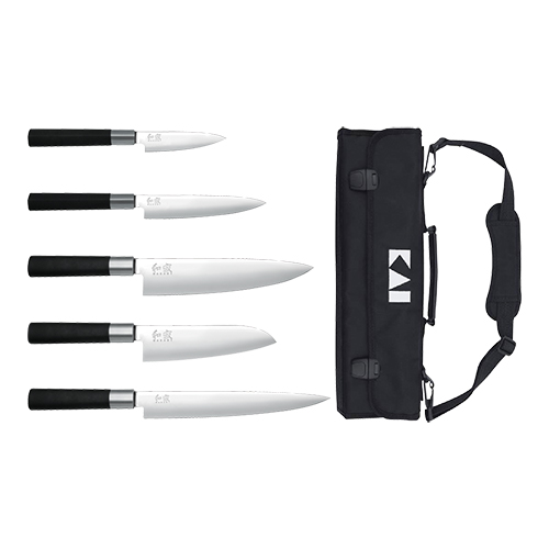 inhoud: officemes 10cm, universeelmes 15cm, koksmes 20cm, santokumes 16cm, vleesmes 23cm, inclusief messen foudraal