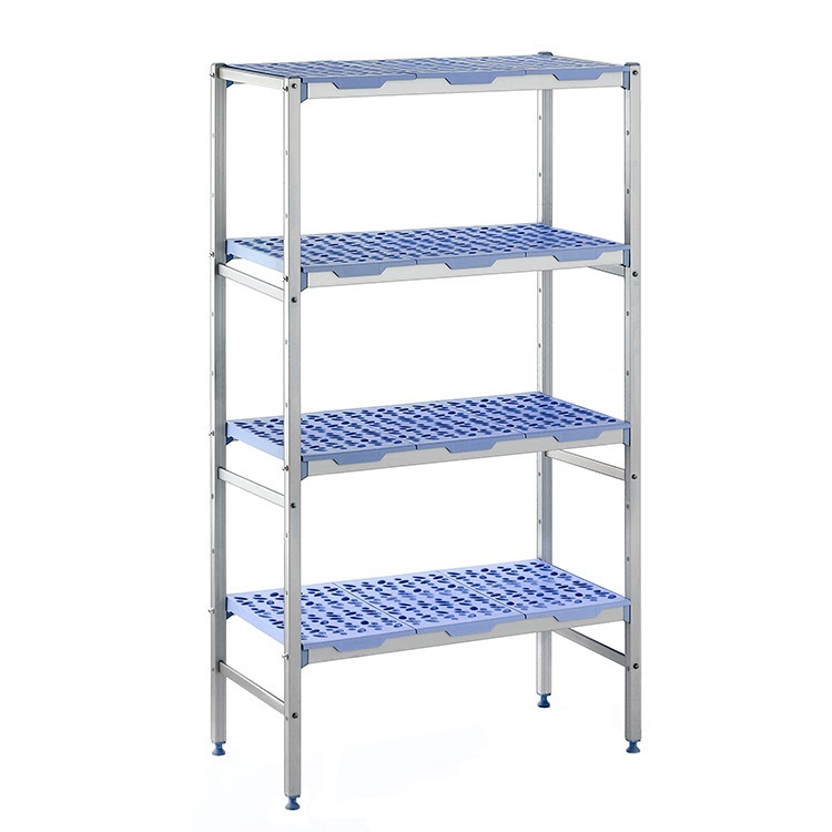 De rekken zijn voorzien van uitneembare en vaatwasserbestendige polypropyleen schappen en hebben geanodiseerde aluminium staanders en liggers.