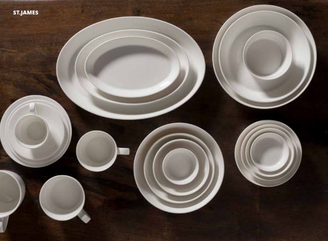 Het lichte servies van st.james is een vitrified fine China porselein met een extra toevoeging van natural bone ash. Door het gebruik van natural bone ash kan een dunner en verfijnder bord worden gemaakt zonder dat het zijn kracht verliest. st.james maakt enkel gebruik van de beste grondstoffen uit europa waarbij de natural bone ash nog steeds uit engeland wordt geïmporteerd.
