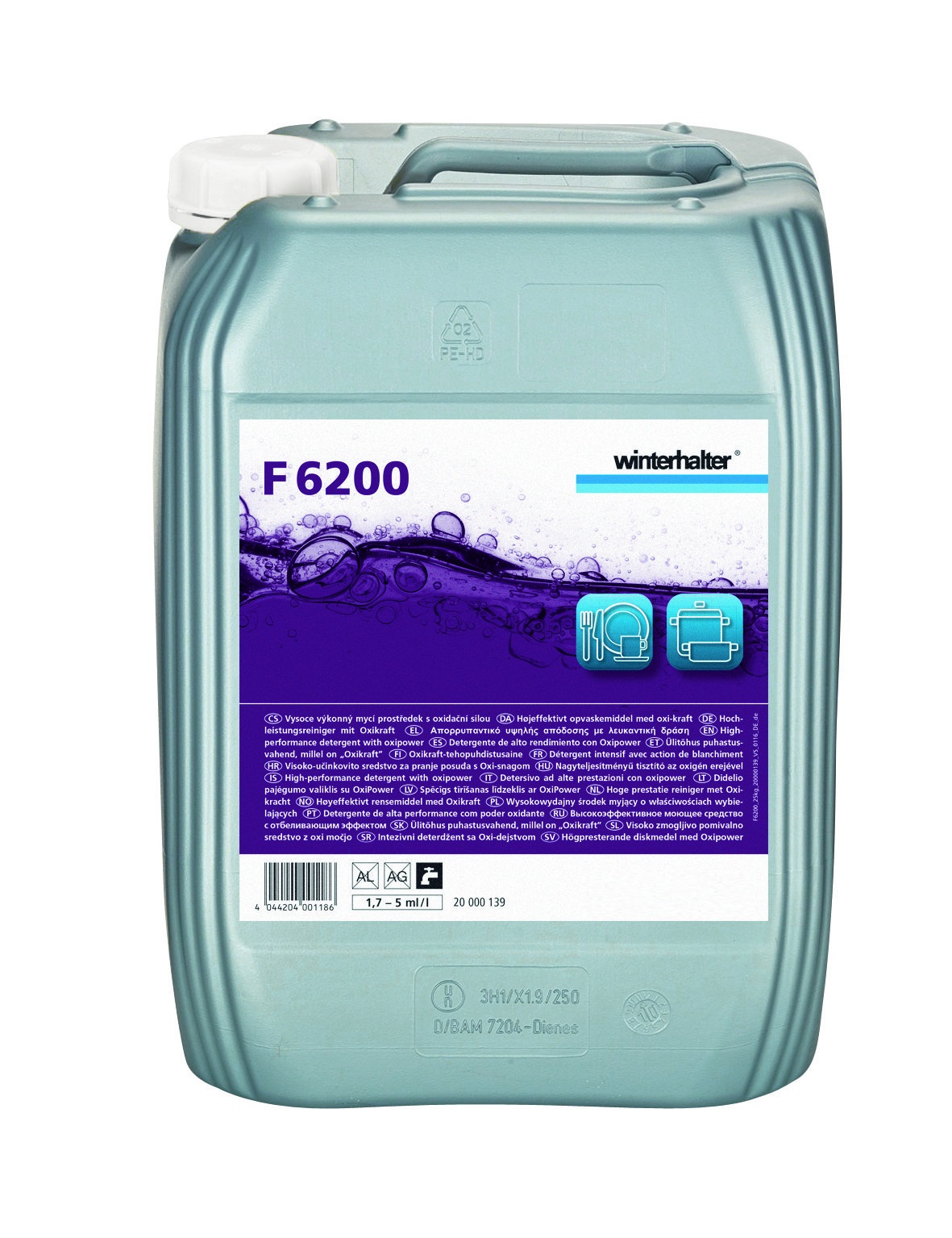Winterhalter F 6200, hoge prestatie reiniger met Oxi-kracht, Vloeibaar, hoogalkalisch reinigingsmiddel met intensieve zetmeeloplossingskracht en geurneutrale inhoudsstoffen, ook voor het verwijderen van koffie- en theeaanslag, can 25 kg.